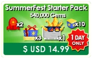 - Summerfest Starter Pack (540,000 gems, 10 Summer Surprise, 3 Super Summer Surprise, 2 Super Fireworks and 1 Sunset Shades for the price of 14.99 USD) available only during Summerfest 2022 on July 28, 2022.