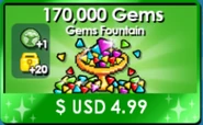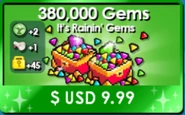 - During Player Appreciation Week 2019, changes were made to IAPs to give more Gems. Bag 'O Gems now gives 14,000 Gems (formerly 9,000), Chest 'O Gems now gives 30,000 Gems (formerly 20,000), Gem Fountain now gives 90,000 Gems (formerly 140,000), It's Rainin' Gems now gives 200,000 Gems (formerly 140,000).
